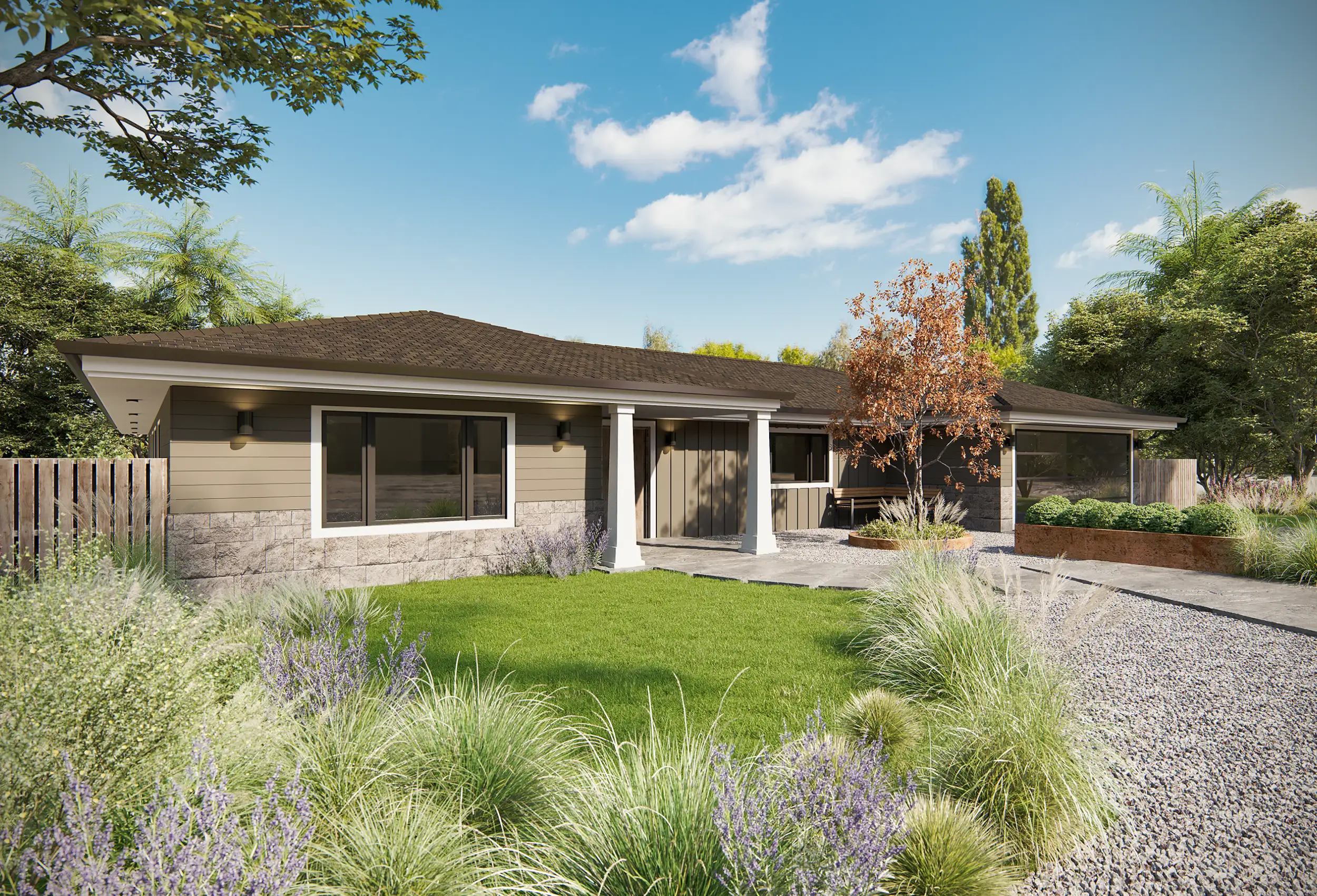 A traditional California ranch home is reimagined with warm horizontal lap siding, vertical board-and-batten accents, and a textured stone veneer base that anchors the architecture to the landscape. Large windows open toward a sun-filled central courtyard, creating an easy, seamless indoor–outdoor flow. At the rear of the property, a detached ADU completes the courtyard composition, echoing the same material palette to form a unified, contemporary retreat designed for relaxed California living.